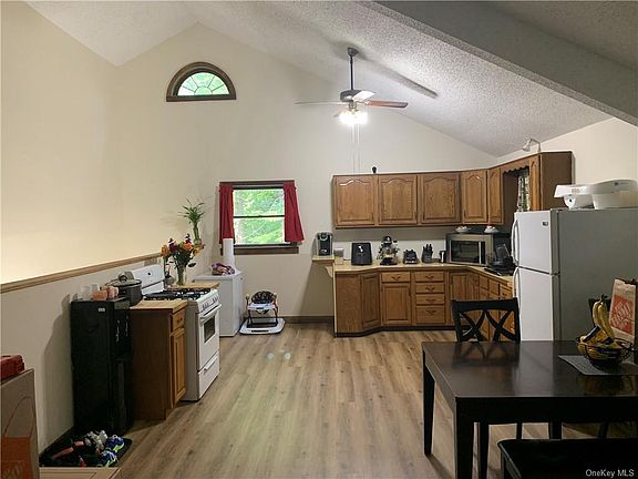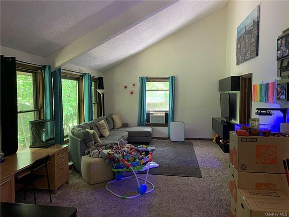 Beautiful 2nd floor apartment, with vaulted ceiling, and very large windows that allow for tons of natural lighting. Open floor plan from living room to eat in kitchen. Two large bedrooms, nicely re-done full bath. Newer flooring in kitchen and bathroom. Carpet throughout the rest of the apartment. Cable ready. Includes 1-car attached garage for parking or additional storage! Laundry hook-ups in garage. Plenty of private parking. Beautiful, private, partly wooded outdoor space, including standalone deck. Landlord pays for tick treatment in yard (3x yearly), exterminator (every other month), and snow plowing. Tenant responsible for snow shoveling, lawn maintenance, oil heat, and propane for range and hot water. Private and secluded, yet close to all amenities and major highways.