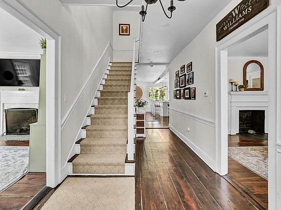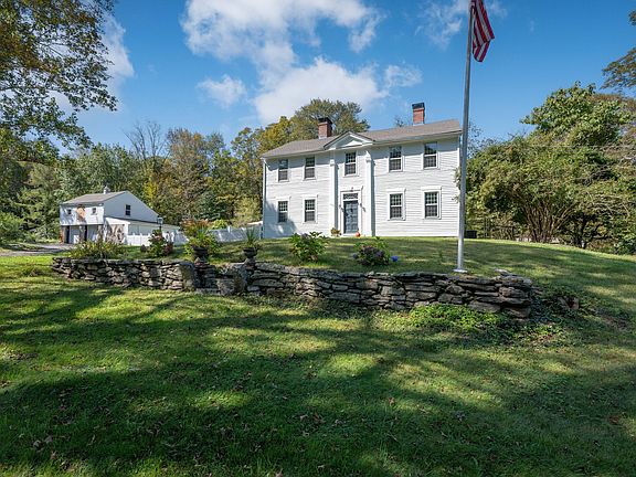 This original 1811 Colonial, surrounded by nature's beauty, will welcome and captivate in all seasons. The perennial gardens, charming stone walls, and mature trees create a visual masterpiece. Inside will surprise and delight with masterfully renovated living space throughout. The spectacular open kitchen with quartz countertops, pantry, newer appliances, and skylights sets the stage for entertaining-move easily to a living room with propane heating stove set in original fireplace, sunroom with vaulted ceiling,and stone patio access. The rich character of the home is evident with fireplace in nearly every room, stunning refinished wide board floors, and period window trim and molding. The dining room and family room captivate, bathed in natural light with multiple large windows offering pretty views.A newly renovated half bath with tile work and wainscoting is easily accessible on the main floor. Refurbished wood floor continue upstairs. The primary bedroom features a center fireplace, large walk-in closet, and renovated bath with double sink and oversized glass shower. Two additional spacious bedrooms offer large windows with pretty views, generous closets, fireplaces, and built-ins. A full bath with tub on the hall, plus bonus office space & laundry. The newly installed fence, two-car detached garage with additional storage & extra parking space add charm and function. This show stopper Located close to the Mass. border and UConn, and I84. Come visit today! Please see provided feature sheet.