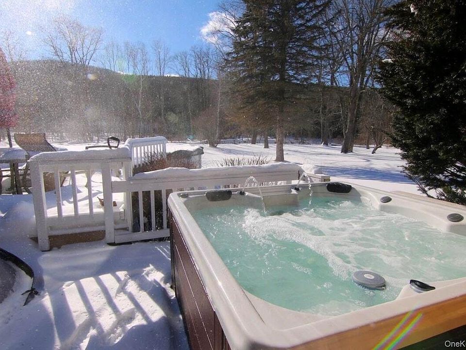 WELCOME TO THE MID-CENTURY WINDHAM ART HOUSE WITH LUXURIOUS YEAR-ROUND HOT TUB, OUTDOOR SEASONAL SWIMMING POOL, WALL-TO-WALL FIREPLACE, CUSTOM BAR, 2.7 ACRES LAND WITH PRIVATE CREEK AND MORE! This gorgeous 5 bedroom 2.5 bath home of nearly 3,000 sq ft offers so much: NATURE and PRIVACY, beautiful lawns, a creek, huge trees; RELAX and ENTERTAINMENT, swimming pool, hot tub, fireplace, bar, grill, Smart TVs, ART paintings & furniture. A queen size bedroom with reclining bed frame and a high-end mattress in the bedroom on the first floor is convenient for people who don't want to do stairs. The kitchen is very large with dishwasher, double fridge with ice maker, gas oven, programmable coffee machine, microwave. toaster mini oven, juice and smoothie makers, kitchen island with cutting board and a lovely view to the patio. The surrounding nature will make you feel relaxed and rejuvenated. There are a casual and a formal dining rooms which sit 14 people total. The patio has a gas grill as well. Two living rooms offer completely different feel. "The Den" is all wood-enclosed and features wall-to-wall wood burning fireplace, custom bar with mini-fridge and ice machine, leather sofas, a "Lazy Boy" and and a 70-inch brand new smart TV, while the sliding doors lead to your patio with a brand new hot tub with blue tooth speakers and stunning mountain views. In the summer you can enjoy the private 30 ft swimming pool as well. The second living room which we call "The French Salon" features Mid-Century furniture, 50-inch smart TV and board-games + a growing library.
