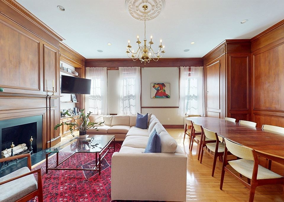 Beautiful decorative fireplaceCentral heating and coolingUpdated kitchenClassic moldingsMarble-tiled bathroomStainless steel appliancesRich wood paneling