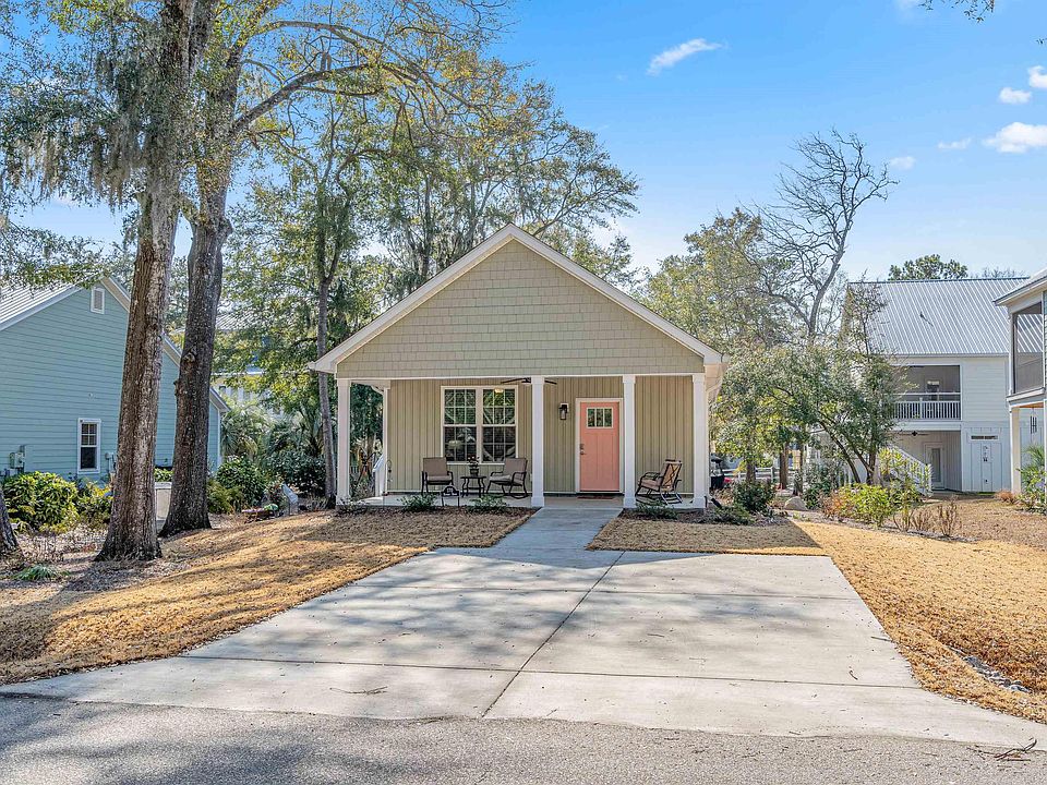 Simply fabulous! This 2-bedroom, 2-bath cottage-style home, located off the south causeway east of Route 17, is just a golf cart or bike ride from the amazing Pawleys Island beaches. It offers fantastic flexibility for various uses, whether you're seeking a vacation home, a long or short-term investment rental, or even in-law quarters. With no HOA, a functional and carefully thought-out design, and handicapped-accessible features, this home is move-in ready and perfect for easy living. The large front porch is ideal for outdoor enjoyment, while the interior boasts tall windows, an updated kitchen with granite countertops, and a handicap-accessible shower and bathroom.