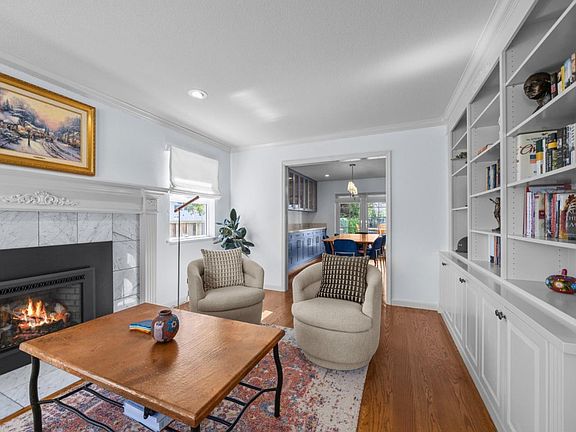 The main home features a bright living room with built-ins and fireplace. The formal dining area includes custom cabinetry and a wine fridge. The modern kitchen offers quartz countertops, stainless appliances, and a sunny breakfast nook that opens to a spacious deck with firepit and landscaped yard - an entertainers dream!