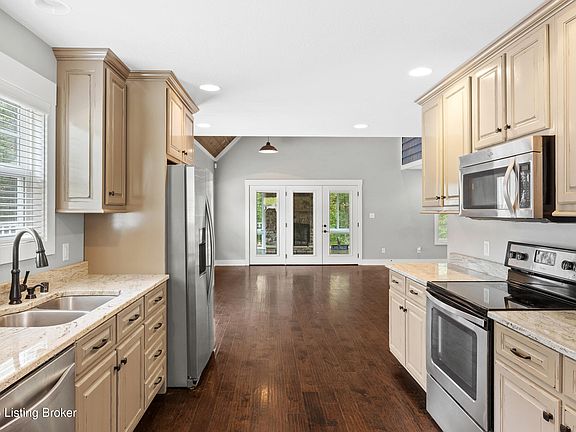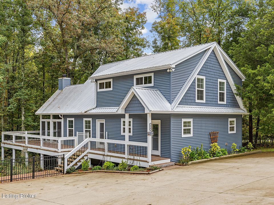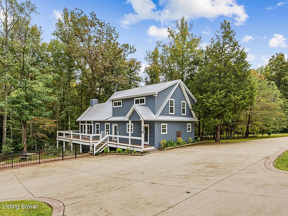 Discover lake living in this custom 4-bedroom home in the gated Moutardier Woods community. Relax on the expansive porch, enjoy the fenced yard, or take advantage of the large detached garage with new concrete driveway. Inside, soaring ceilings and natural light highlight the floor-to-ceiling stone fireplace in the sunroom. A cozy nook overlooks the vaulted living room, while the granite/stainless kitchen and hand-scraped wood floors add style and function. Evenings are best around the fire pit after a day on the lake. This property includes an owned dock with direct Nolin Lake access, plus Moutardier Marina and Campground just over a mile away. Your perfect retreat for lake life awaits!