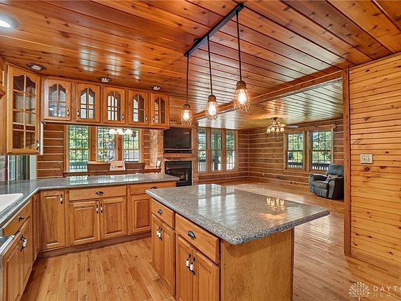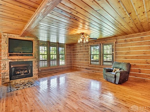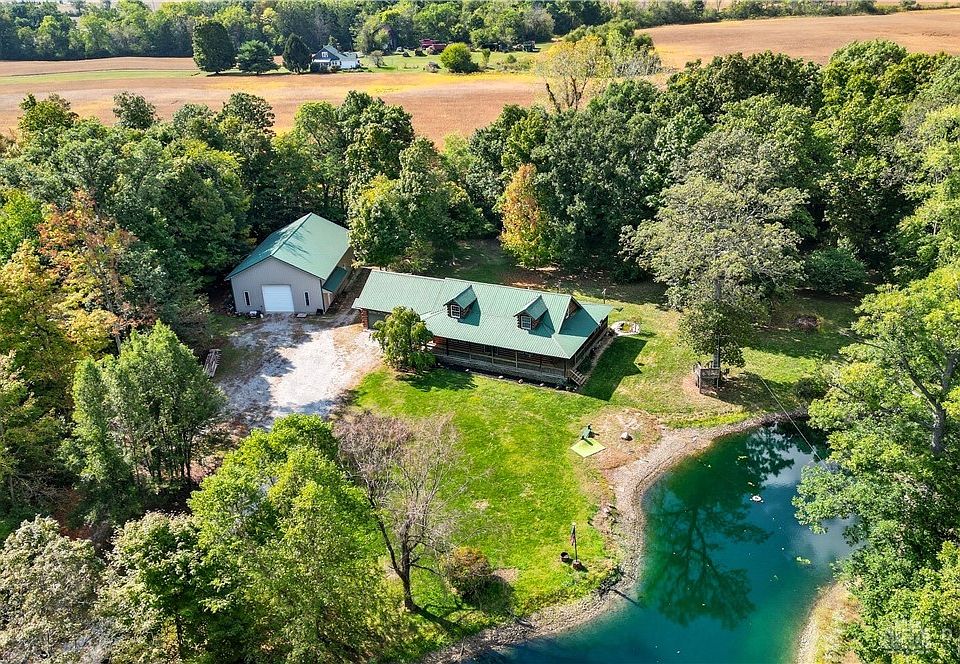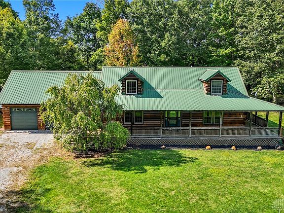 Absolutely Gorgeous Log Home nestled on over 11 acres. Metal roof. Woods on one parcel, with Pond. A Standout 56 x 36 insulated Pole Barn that has a bath. Covered front wrap around porch and a back porch. Great room sports a stone gas fireplace.