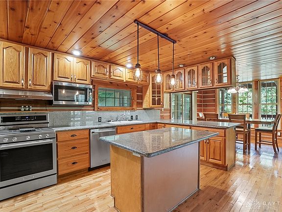 Insulated pole barnBack porchMain floor primary bedroomGranite countersWoods on one parcelStone gas fireplaceFully equipped eat-in kitchen