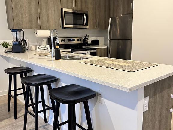 Chef's Kitchen Stainless steel appliances, quartz countertops, and ample storage blend style and function.