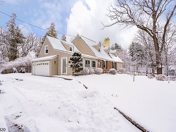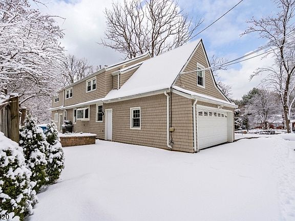 Perched on a hill along New Providence Road, this two-story ranch offers strong curb appeal, visibility, and a spacious property in desirable Mountainside. A covered front porch welcomes you home perfect for morning coffee or relaxing outdoors.Inside, the large living room features wood flooring, large windows for natural light, and a stone wall with a wood-burning fireplace. The adjacent kitchen is equipped with stainless steel appliances including a Wolf gas range with hood fan, granite countertops, pantry storage, and a separate dining area. A formal dining room with wood flooring sits just off the kitchen and living room, ideal for entertaining.The dining room opens to a spacious family room with a second wood-burning fireplace, wet bar, full bathroom, and sliders leading to a private patio and deck. All five bedrooms are located on the second floor. The primary suite features a walk-in cedar closet and full bath with shower stall. One adjoining bedroom is currently used as additional closet space and can easily be restored. The remaining four bedrooms are generously sized and share a full hallway bath.The finished basement provides flexible space for recreation, office, or gym, along with a laundry room and half bath. Exterior highlights include a private side yard, storage shed, attached two-car garage, and paver parking near the garage for additional off-street parking. Conveniently located near downtown Westfield, NYC train access, and nearby parks and trails.