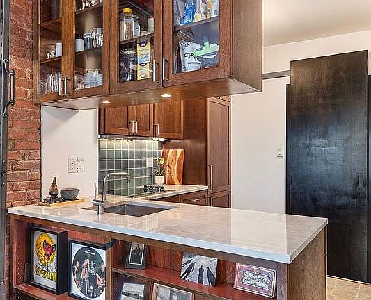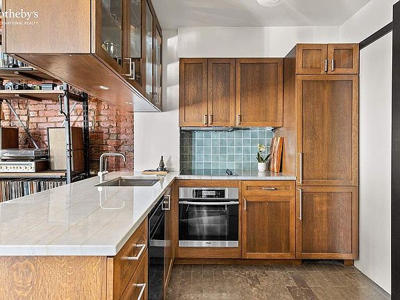 The open kitchen is a chef’s delight, featuring striking quartzite countertops, custom oak cabinetry, and Miele appliances, including a paneled refrigerator that seamlessly blends into the design. The bedroom is lined with built-ins and abundant storage, while the elegantly renovated bathroom offers a tub-shower combination, tiled walls and floors, and a vanity with additional storage. Hardwood floors, well-placed closets, and dimmable lighting complete the home’s thoughtful touches.
