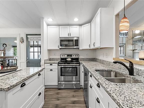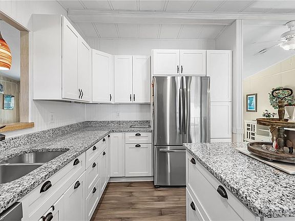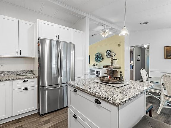 This home offers plenty of room for entertaining whether enjoying time on your large, screened lanai sipping a class of iced tea and speaking with the neighbors. Or if the summer heat is a bit much escape inside to the family room. The newly remodeled kitchen has plenty of cabinets and countertop space and the island is the perfect place for food prep while chatting with friends. The dining area has sliding glass doors that bring in additional light that extends into the living area and offers a nice view or appreciate the privacy with the enclosed blinds in the slider door. You will appreciate the convenience of the large platform with steps off both ends making access to the back shed that contains the laundry even easier. In addition, there is an additional storage shed behind the home. Getting back to the inside of the home you have 2 spacious bedrooms, both bathrooms have been remodeled. Conveniently located next to the clubhouse and pool area. If this was not enough you are just minutes away from 5th Avenue, Coastland Mall and the beaches of Naples. Windjammer Village of Naples is a 55 plus community with amenities, activities, low fees. Come see for yourself.