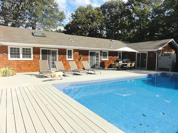 Coming Up Roses Sunny and bright with a clear Southern exposure, this nearly 1900 SF one level home exudes cheer and has multiple skylights throughout to maximize the light. There is a first floor master suite with access to the large deck, and an additional 3 bedrooms and 1.5 bathrooms. The center of the home has a renovated kitchen, dining room and large den/family room with fireplace. The house has been updated and maintained meticulously by the owners, and the care here shows. The list is almost too long, but includes updated kitchen and baths, windows and doors, a new roof, exterior paint, deck and pool liner. Other amenities are hardwood floors, central air, sprinkler system, and Town water. Just shy of ? acre, the grounds are impeccable and beautifully planted both in the rear pool area with expansive deck and outdoor shower, and in the front where the property enjoys a gentle slope setting it back from the street. In addition there is an oversized 2 car garage and room to expand the house if needed.This is a wonderful and convenient location just blocks from the great Peconic Bay, marinas, farm stands, and a quick drive to Southampton, Water Mill, Bridgehampton, or even Sag Harbor. Priced to sell, $755,000.