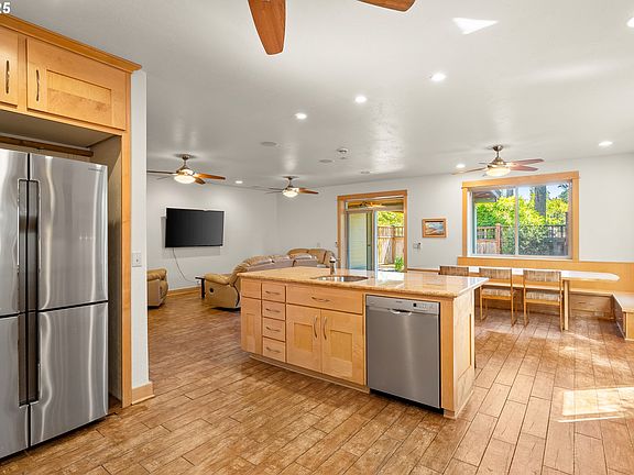 This custom-built, single-owner home is a rare find, blending thoughtful design with quality craftsmanship throughout. The main floor features durable tile flooring, cherry wood stairs, and maple cabinetry, while the upper level boasts bamboo flooring, knotty alder trim, solid wood doors, and vaulted ceilings with skylights. The gourmet kitchen is a true centerpiece, complete with granite countertops, a large island, 6-burner gas range, built-in range and hood, double ovens, stainless steel appliances, built-in dishwasher, disposal, pantry, and freestanding refrigerator. The kitchen is even plumbed for an espresso maker and includes a custom ash dining table with built-in dining bench seating. The spacious family room offers ceiling fans and abundant natural light, while the upstairs bonus area shines with vaulted ceilings and skylights. The primary suite is designed for both comfort and function with a built-in desk, ceiling fan, built-in TV, sun-tube closet, and a luxurious soaker tub. The hall bath is highlighted by a one-of-a-kind custom concrete sink. Additional features include a covered patio with ceiling fan, custom shelving in the garage, and LEED certification for efficiency and sustainability. This home was built with care, attention to detail, and lasting quality—ready to welcome its next owner.