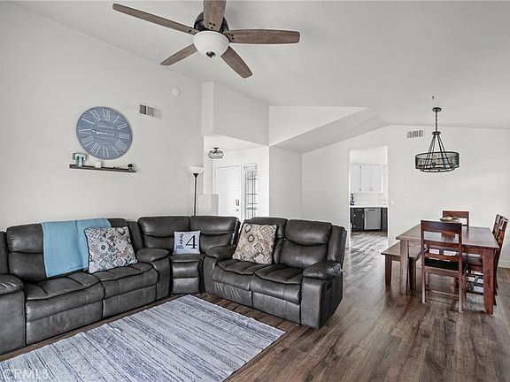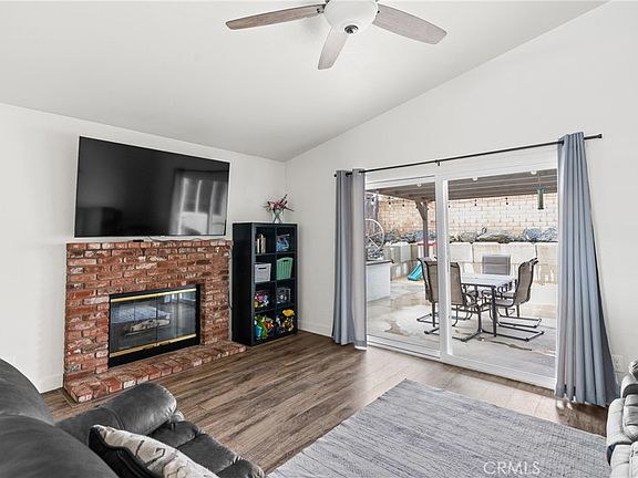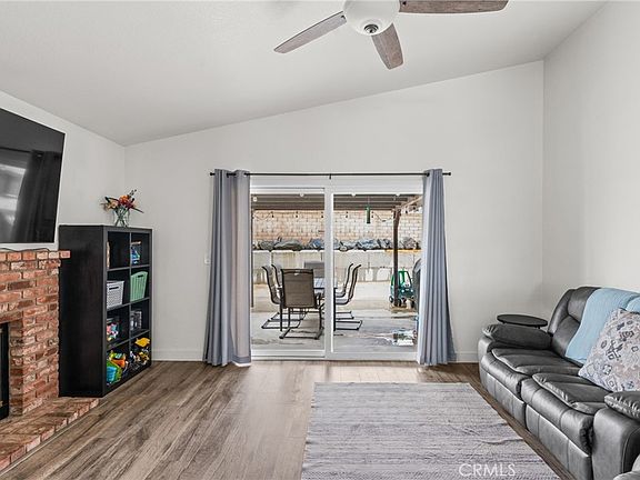 Inside, the light-filled floor plan connects the living, dining, and kitchen areas for a spacious and seamless flow. The living room features laminate flooring, cozy fireplace, ceiling fan, and a sliding door providing access to the backyard—perfect for both relaxing and entertaining. The kitchen offers abundant storage, stainless steel appliances, and plenty of room for everyday cooking and gathering.