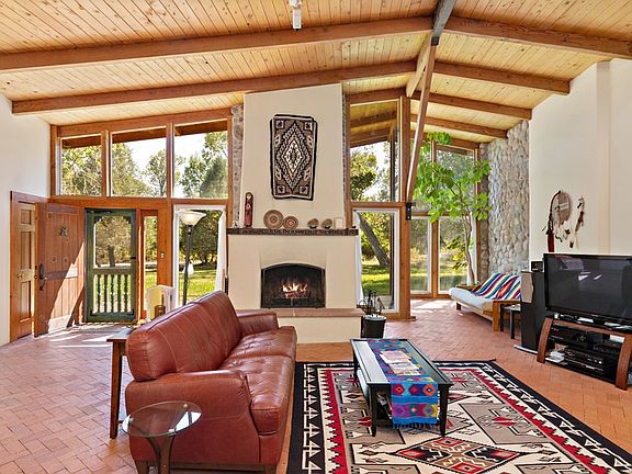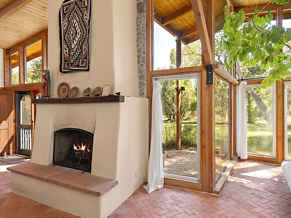 Nestled among several mature deciduous trees on 6.59 acres with the El Rito River running right through the property in the idyllic Northern New Mexico Village of El Rito is this secluded and peaceful, lodge-style home with an observatory & telescope. Wonderful views of the Sangre de Cristo's across the Rio Grande Valley. Surface Irrigation rights and a private well transfer with new ownership. The home is very light-filled with a high ceiling in the great room, brick floors, built in bancos and a formidable territorial style fireplace with a sandstone hearth and hand-carved walnut mantle that reads "In Wilderness Is The Preservation Of The World". A built in storage closet with the old spanish style doors accent the great room. The dining room with its massive stone fireplace and open sunny kitchen, is large enough to include a pool table. The Master bedroom is spacious and has another large stone fireplace, french doors and en suite bathroom. There are two more bedrooms and another full bath. Outside you will find a stable area, tack shed and covered hay storage. The upper half of the property is fenced for horses and borders Carson National Forest. The observatory & telescope on the property, are an extra added bonus, including the solar operated roof that slides away when you want to view the stars and the night sky.