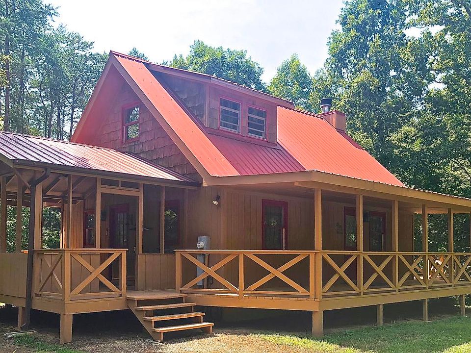 WELCOME HOME!! BREATH TAKING FROM THE MOMENT YOU DRIVE UP. 1 & 1/2 story log cabin style home on 5.02 ACRES!! 3 sided wrap around porch . Level lot around the house. Private gated driveway. 18 x 21 carport and 12x12 concrete floor and block shed. There is also a PRIVATE 4 wheeler trail to the left. Acres include a spring and a creek. All wood exterior (reverse board & bat style), metal roof, custom ordered windows for so much natural light! custom woodwork throughout this home, even the ceilings! QUALIFIES FOR ZERO DOWN PAYMENT LOAN, USDA! ***BACK ON MARKET DUE TO BUYER INABILITY TO GET FINANCED