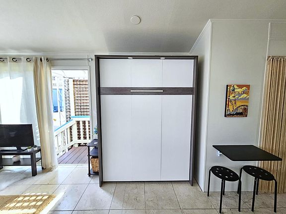 Coastal Dream on Distinguished West Cliff Drive! Don't miss this amazing, well-maintained 'park model' tiny home just moments from the beach, world-class surf, the Santa Cruz Beach Boardwalk & Wharf. Conveniently located on bus line to UCSC and downtown, with parks, restaurants, theaters and shopping nearby - you are surrounded by all the best that Santa Cruz has to offer! This bright and open studio features beautiful marble flooring, creating a stylish and functional living space. The full-sized kitchen boasts a gas stove, ample storage and a unique ocean view refrigerator magnet. A full-wall Murphy bed and pullout couch nook provide for flexible sleeping arrangements. A spacious bathroom includes a walk-in shower and generous reach-in closet. Enjoy year-round comfort with a mini-split heater/AC unit. The low-maintenance, fenced yard features faux turf, a cozy seating area and a storage shed, plus space for bikes & surfboards! Clearview Court Mobile Home Park is an all-age, pet friendly community with on-site laundry facility and one assigned parking space. Space rent is $1522 per month. Close your eyes, hear the waves, smell the salty air and envision the possibilities: full-time living, a relaxing weekend retreat, student housing, or potential rental.