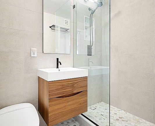 Expansive east-facing windows flood the home with morning light, highlighting newly installed wide-plank oak floors and a serene modern palette. The spa-like bathroom features a floating vanity, designer fixtures, and a heated bidet for everyday indulgence.