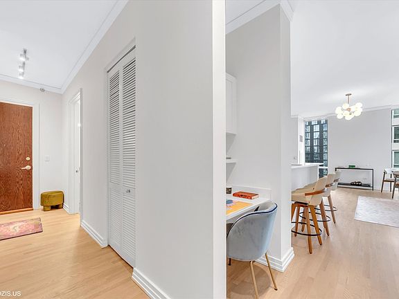 AWESOME TWO BEDROOM TWO BATHROOM CORNER UNIT IN SOUTH LOOP/PRINTERS ROW ON HIGH FLOOR CLEARING RIVER AND CITY VIEWS. AWESOME OPEN LAYOUT FEATURING HARDWOOD FLOORING, TRIM AND CROWN MOLDING DETAIL AND MORE. KITCHEN FEATURING WHITE CABINETRY, QUARTZ COUNTERTOPS WITH BREAKFAST BAR AND SS APPLIANCES. LARGE LIVING AND DINING SPACE. PRIMARY SUITE WITH BUILT-OUT DUAL CLOSETS AND LARGE BATH WITH DUAL SINK VANITY. SECOND BEDROOM AND FULL BATH WITH WALK-IN SHOWER. BUILT-IN WORK FROM HOME SPACE WITH QUARTZ COUNTER AND CABINET. IN UNIT WASHER/DRYER AND LARGE HALL CLOSET. PRIVATE BALCONY WITH VIEWS OF DOWNTOWN. PARKING AND STORAGE SPACE INCLUDED.