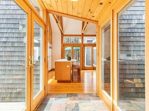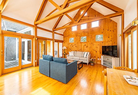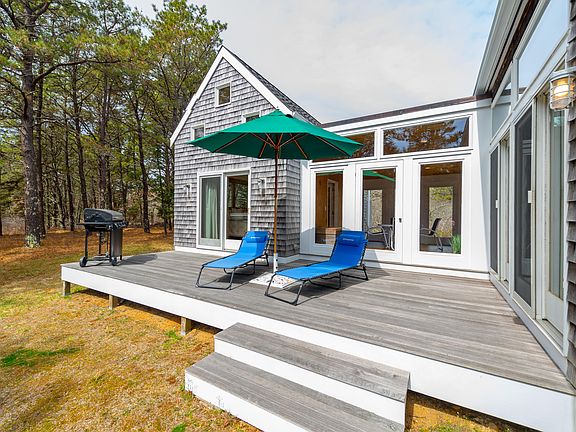 GET READY FOR SUMMER! A premier beach house location awaits you. Within minutes, you will be at the summer entrance gate to Long Point Beach, a Trustees of Reservations property with spectacular surf beach, fresh and salt-water ponds, and hundreds of acres of conservation land. Or, if you would like a change of beach scenery, you also have access to Lamberts Cove Beach. This contemporary beach house is situated on 3 secluded wooded acres, with plenty of room for expansion. The dramatic vaulted ceiling grand room with kitchen, living, and dining space, is the focal point of this unique home and a place for all to convene. The primary wing with a cathedral ceiling bedroom, full bath, and outdoor shower was cleverly designed for privacy and has direct access to the screened porch and sliders to the deck for outdoor enjoyment. The guest wing, located on the opposite side of the home, offers 2 bedrooms and a shared full bath. There are 3 sets of sliders in the great room that lead to the deck and second outdoor shower. A new roof and HVAC system were just installed. With no rentals in place for the season, this property is ready for you to move in and enjoy the ultimate in