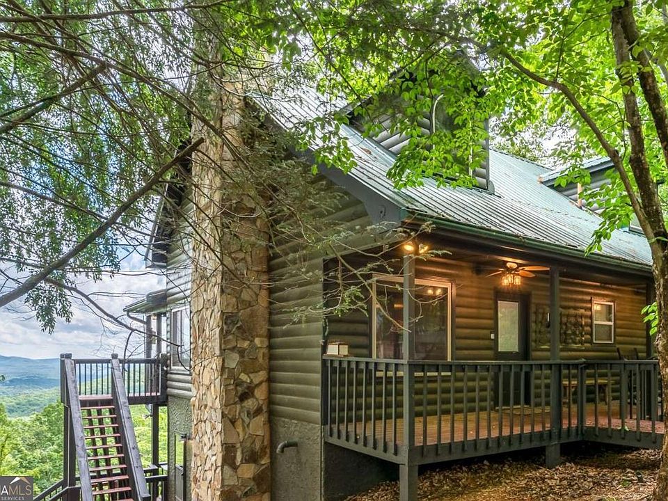 Wake up to long-range mountain views from this beautifully appointed 3BR/3BA cabin in the heart of the Georgia Mountains. Designed for both comfort and entertaining, the open great room flows into the kitchen and dining area with breathtaking views, while a convenient main-floor laundry adds ease to everyday living. A spacious loft and finished terrace level with media/game room and rec space provide multiple gathering areas-ideal for hosting friends, family, or guests. Step outside to expansive decks, a bubbling hot tub overlooking the mountains, and a cozy covered front porch perfect for morning coffee. Recent updates include fresh interior/exterior paint, updated showers, and a new fenced backyard backing to a tranquil common area and the National Forest, ensuring a serene natural backdrop. Located in the sought-after Walnut Mountain community, you'll enjoy swim/tennis facilities, lakes, and hiking trails with gated security-all just minutes from downtown Ellijay's restaurants, shops, and local attractions. Offered furnished (with only a few exclusions), this property is ready to enjoy. Whether as a full-time home, private mountain escape, or guest-ready retreat, this cabin delivers the mountain lifestyle you've been searching for. HOA dues include water and amenities.
