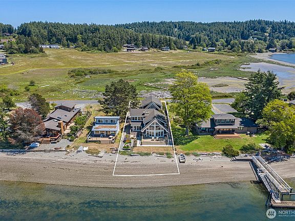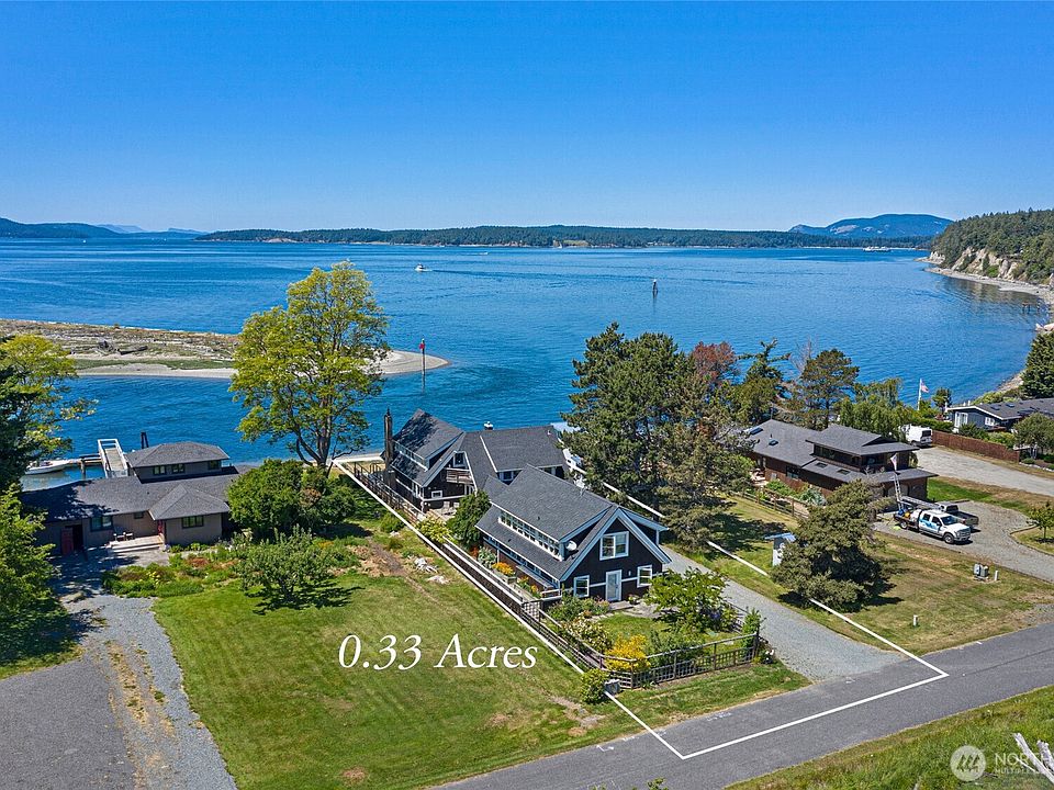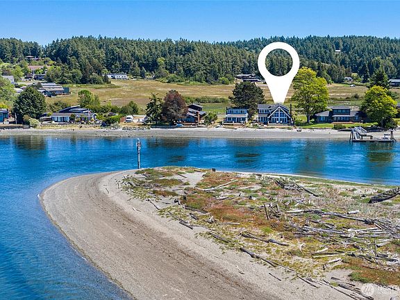 Exceptional west-facing waterfront retreat on Weeks Point, overlooking the entrance to Fisherman’s Bay. Enjoy over 60’ of no-bank shoreline, vibrant sunsets, and thoughtfully designed indoor-outdoor living on a beautifully landscaped .33-acre parcel. The 2319 sf main home showcases cedar ceilings, a chef’s kitchen, custom built-ins, and an open floor plan ideal for entertaining. The home includes 3 beds/4 baths, plus a dedicated office with fiber internet—perfect for remote work. A 1616 sf guest house offers 1 bed/1 bath, full kitchen, and spacious living area, ideal for guests or multigenerational living. Immaculately landscaped, connected to public water and sewer, and just minutes to Lopez Village. Luxury island living at its best!