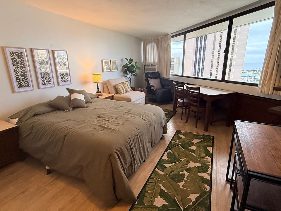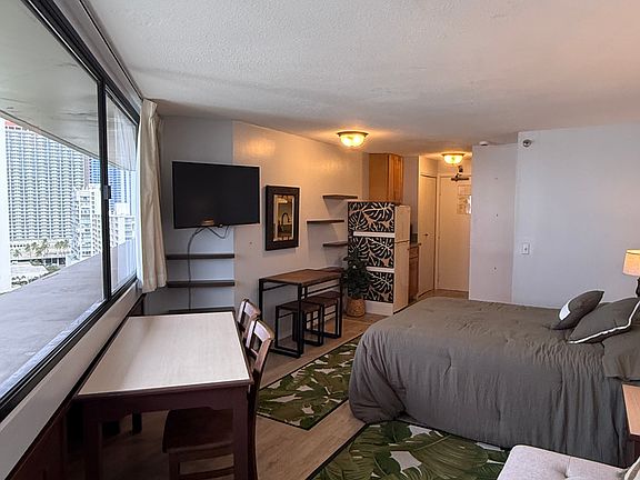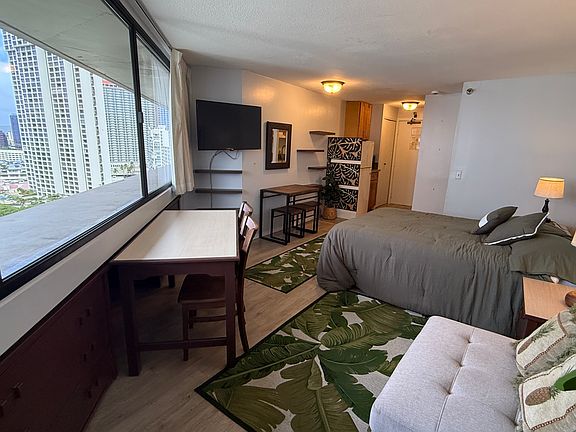 Fully furnished studio with a functional kitchenette, perfect for temporary housing in a prime location. Enjoy the convenience of walking to Ala Moana Shopping Center or the newly revamped Ala Moana side of Waikiki with its great bars and restaurants. Rent includes all utilities; tenant pays GE tax, and for rentals under 6 months, TA/OTA tax as well. Lease terms are flexible.