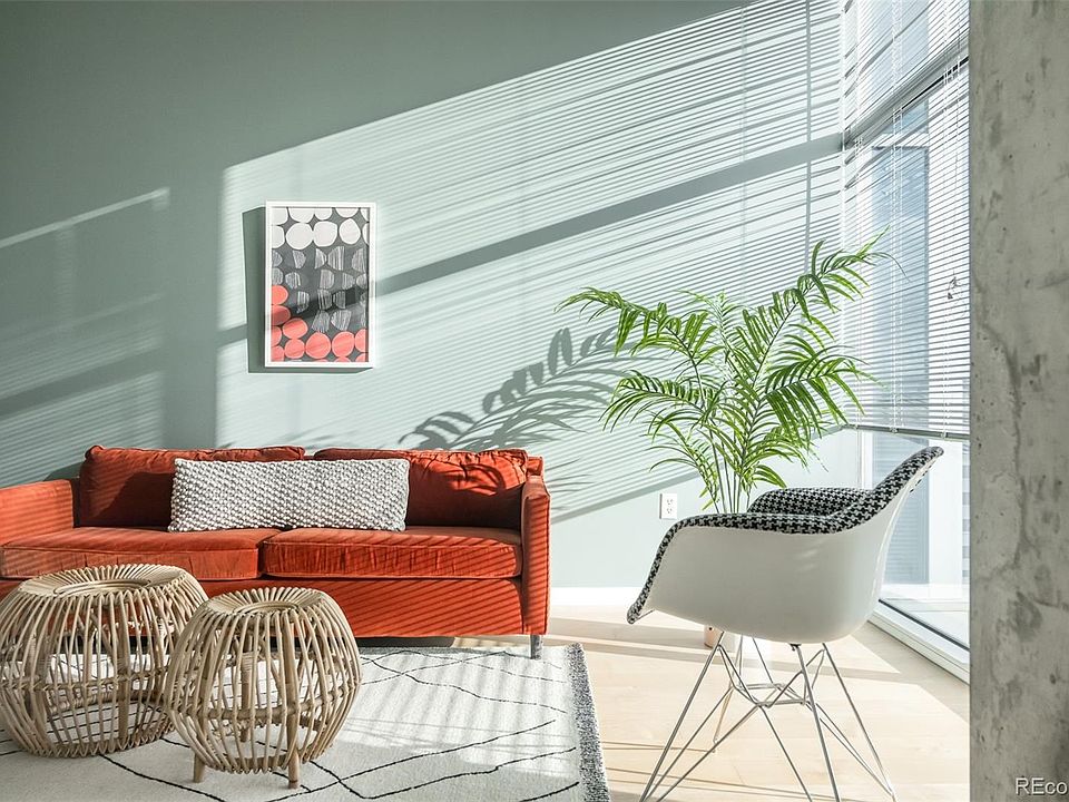 Talk about views! Super cool Glass House condo in the very walkable Riverfront Park neighborhood. Situated ideally in the building with an expansive, breathtaking 180° view of the mountains, Commons Park, Platte River, downtown and LoHi. This unit has an open, sunny floorplan and showcases floor to ceiling windows on its entire west wall, hardwood floors, fresh paint throughout and new light fixtures. The kitchen features sleek granite countertops as well as plenty of counter/prep space and a great bartop for entertaining. A large balcony is perfect for relaxing at the end of the day and taking in the pulse of the city. The bedroom boasts an accent bed wall, attached shelving unit and direct access to the balcony. A full bathroom and a large walk-in closet have ample storage, plus there's a convenient laundry closet with included washer/dryer. With a deeded garage parking space and storage, along with all the amenities Glass House features - a secure building, reception desk, top-of-the-line fitness center, expansive clubhouse and outdoor pool/hang-out spaces - this condo is pretty much perfect!