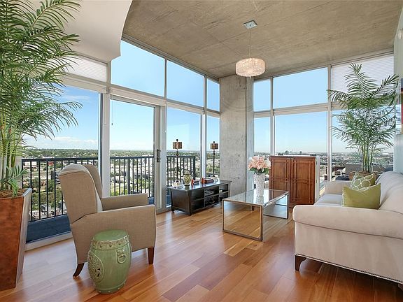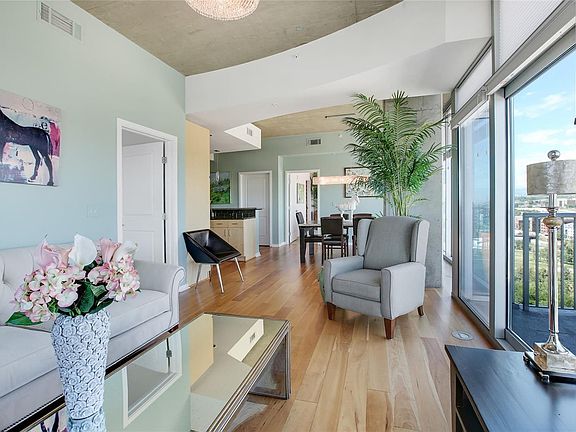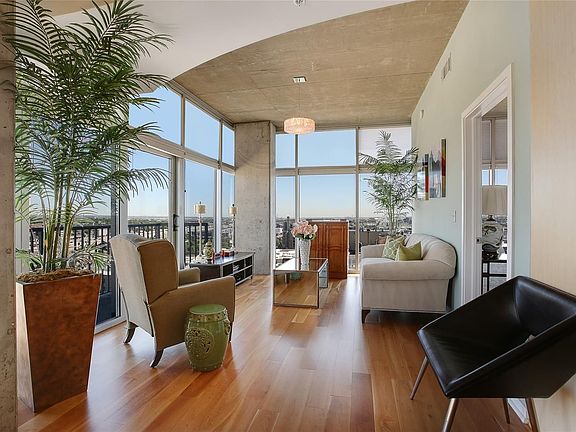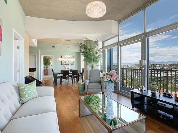 Jaw-dropping Front Range views from this 15th-floor Glass House west-facing corner unit. Open floor plan with floor to ceiling windows provide incredible natural light. Hardwood floors. Open kitchen features a breakfast bar with granite countertops, stainless appliances, large pantry and abundant cabinet space. Upgraded lighting includes Schonbek Swarovski crystal light fixtures. Each bedroom has an en-suite bath with walk-in closet. Each closet features custom built-in shelves and drawers. Built-in work desk. Two garage parking spaces and storage space. Glass House is a full-service luxury building. Building amenities include pool/clubhouse, large fire pit, BBQ grills and continental breakfast as well as access to the Riverfront Athletic Club. Incredible location just steps from parks, restaurants, and Union Station. Buyer to pay .5% Riverfront Park Community Foundation Transfer Fee.