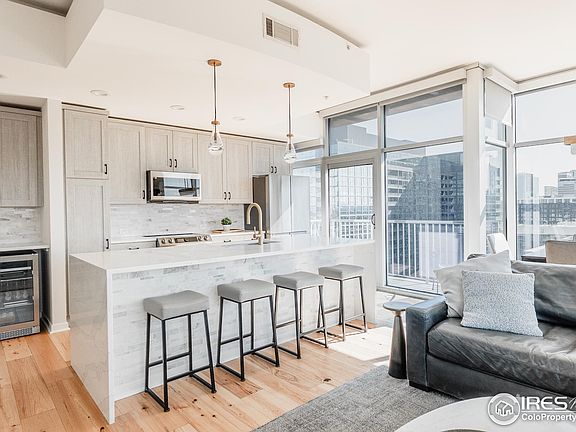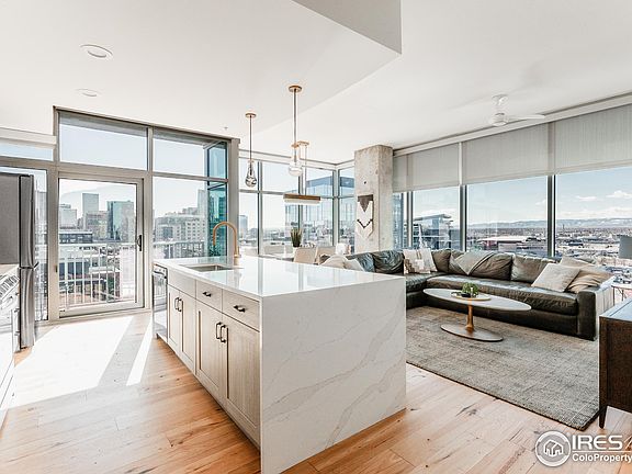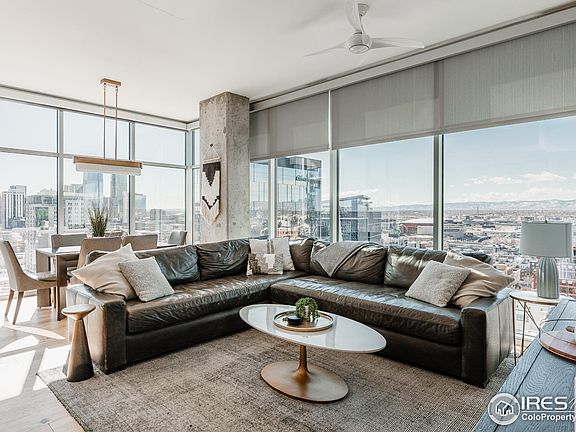 High above the City on the 18th floor of the iconic Glass House, this premier corner unit in the coveted 8 stack delivers the most breathtaking, unobstructed views in Denver. From Coors Field fireworks and Union Station to the majesty of the Rocky Mountains and verdant expanse of Commons Park, every sightline is framed by South and West facing floor-to-ceiling walls of glass that illuminate the space with natural light by day and transform the skyline into a mesmerizing spectacle by night. View connoisseurs in the know recognize that this epic vantage point in the City is almost impossible to find. A high-end renovation has transformed this loft into the epitome of modern luxury. The gourmet kitchen is a true showpiece with a waterfall island, veined quartz counters, custom cabinetry and stainless appliances. The open-concept design, soaring ceilings, and designer lighting create an ambiance of sophisticated urban living. The primary suite is a tranquil retreat where city and mountain views become living artwork. Its en-suite bath exudes elegance with a statement vanity, exquisite tilework and a frameless glass shower. Exposed concrete, wood and glass create a striking interplay of texture and contrast throughout the home. A gracious formal foyer offers a stunning first impression and a private balcony offers a front-row seat to Denver's vibrant pulse. For a turnkey experience, purchase this home furnished with curated pieces designed to complement the refined aesthetic. Resort-style amenities including a rooftop pool, 24-hour concierge and complimentary membership to Riverfront Athletic Club elevate your lifestyle, while weekend breakfasts and movie nights foster a vibrant community. Located in Riverfront Park, this premier address places you steps from Union Station, LoDo and the Platte River Trail, offering the perfect blend of city energy and outdoor recreation. Two designated garage parking spaces and a private storage unit provide unmatched convenience.