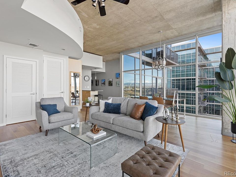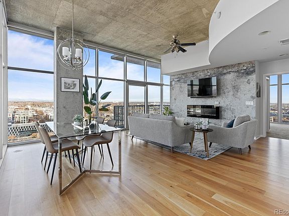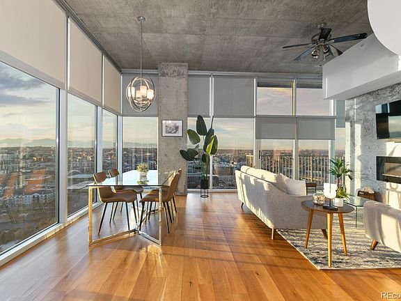Here is your rare opportunity to own this 21st floor jawbone glass west facing unit in the Glass House. 2116 has unparalleled views of the Rockies, front range and Flat Irons that makes the sunset a must see. Walk into the unit and you are greeted with 15ft ceilings, equipped with full automatic Lutron blinds (54k value) and you are drawn to the glass and views. 2116 is the epitome of why the Glass House boasts its' name. The unit features a fully open floor plan with a bar top kitchen and stainless steel appliances. Enjoy the decorative fireplace wall and escape to the towering balcony perched atop Denver. Move along to a full bathroom and the all glass bedroom that is a great size for any size bed and dressers to fit, which is rare for 1 beds in the building. The closets have been custom fitted and are brand new. The Lutron shades in the bedroom are on a rail system keeping them flush to the window to enjoy great acoustics and COMPLETE privacy. The unit comes with a storage cage and parking garage. Do not miss your opportunity to own this premium unit with the best views for the price in Denver.