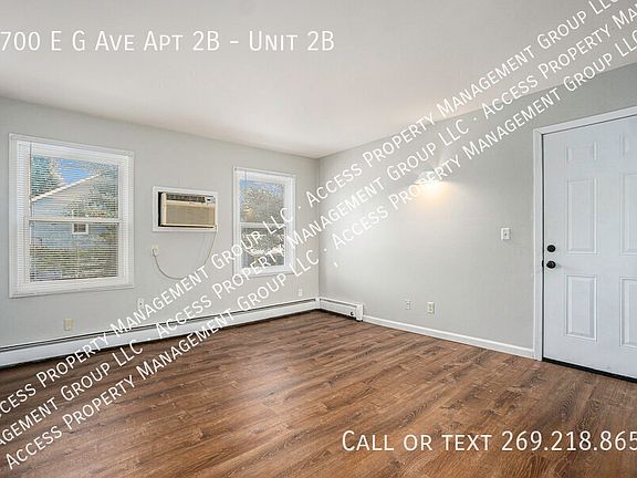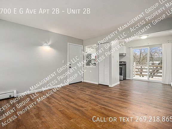 1700 E G Ave Apt 2B is an updated 1 bedroom apartment located near Gull Rd and close to Kalamazoo! Apt 2B is located on the second floor of building 1700 (front building closest to G Avenue). This unit features updated paint and flooring and a very modern feel inside. The living room is very open and has a semi-open floor plan to the dining room and kitchen. The kitchen features a "window" to the living room and there is also a large sliding door to the balcony in the dining room! The living room has a wall-mounted air conditioning unit also! There is also a full bathroom with linen closet and a large bedroom with additional closet space. Tenant pays electric only. Gas, heat, water/sewer, lawn care, trash and snow removal are all included! Shared coin-op laundry facilities are available in the rear building (1710). Pets are ok - fees and restrictions apply. NO SMOKING!