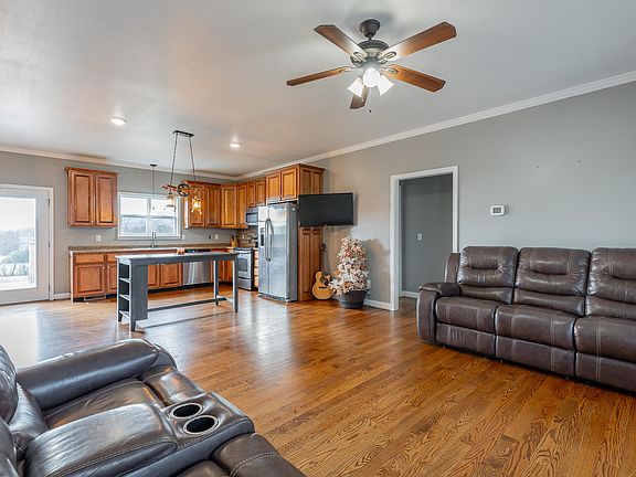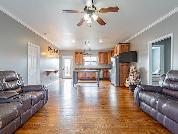The exterior features low-maintenance siding, a covered front porch, a two-car garage, and a wide driveway for easy parking. Situated on a level lot with room to play, garden, or simply enjoy the view, this home brings together comfort, convenience, and small-town charm.