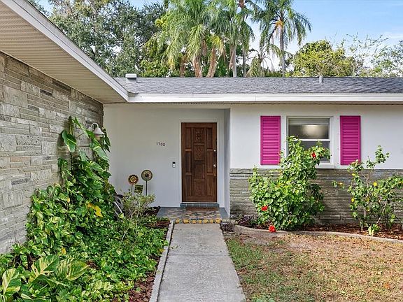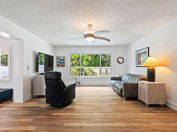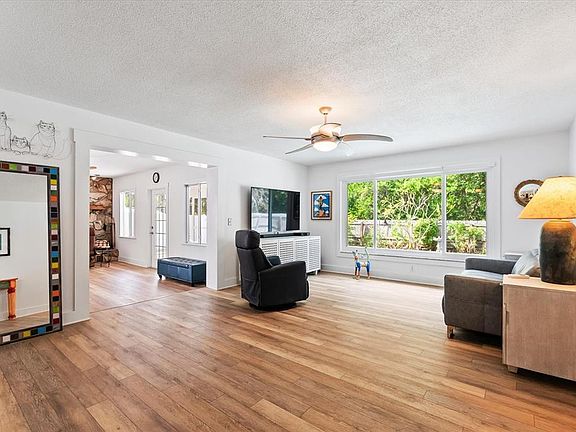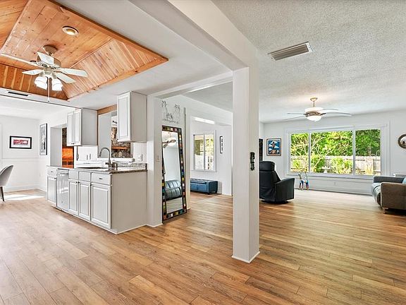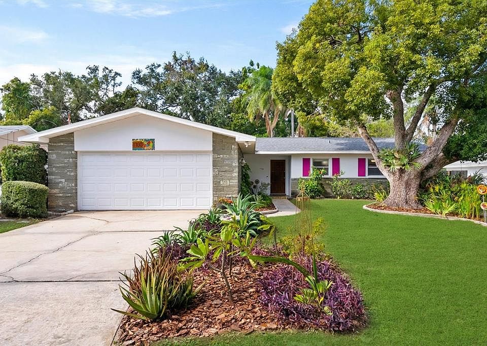 A whimsical mid-century escape in the heart of Dunedin! Adjacent to the peaceful trails of Hammock Park, this mid-century modern treasure feels like something out of a storybook. With over 1500SF of sunshine-filled living space, this 2 bedroom, 2 bath retreat blends artistic charm with everyday comfort. Inside you will find open airy rooms with luxury vinyl flooring, two updated bathrooms, and a spacious eat in kitchen that just begs for morning coffee and easy Sunday breakfasts. The wood burning fireplace in the family room adds a cozy glow on cooler nights, while the huge picture window in the living room perfectly frames the sparkling pool and leafy views beyond. Step outside and feel the magic of a shimmering pool, two expansive wood decks, and brick pavers that set the scene for sunny afternoons and laid-back evenings with friends. The fully fenced yard means your furry companions can roam freely in "Dogedin", one of Florida's most pet-loving towns. Practical comforts are all here too: New roof (2024), Electric water heater (2019), Central AC (2017), Hurricane shutters, Upgraded ceiling fans throughout and the peace of mind that comes with being outside the flood zone and untouched by storms. Best of all, you are just a short stroll from the Dunedin Fine Art Center, the Pinellas Trail and all the creative energy that makes this little coastal town so special. This is more than a home...it is a vibe. A place where art, nature and good company come together under the palms.