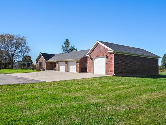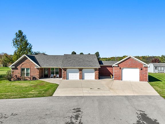 Welcome to this beautiful brick ranch on nearly 6 acres, offering the perfect blend of craftsmanship and country charm. A blacktop driveway leads you to a spacious 3-car attached, climate-controlled garage ideal for car enthusiasts - also equipped with a custom tile dog bath! Inside, you'll find a bright, open-concept floor plan featuring a stunning kitchen with white quartz countertops, a large island, and farmhouse sink. Warm tile flooring runs throughout the home, complimenting the tray-ceiling living area inviting natural light. The primary suite is a true retreat with his/hers closets, a sitting area, and a spa-like en suite bath with a walk-in tile shower. A second bedroom offers its own attached full bath, perfect for guests. There is also a private office with built-in cabinetry. Step outside to enjoy wide-open views, a custom brick fireplace, and an impressive 50x70 pole barn with concrete floors and electric. Peaceful, private and packed with upgrades - this home has it all!