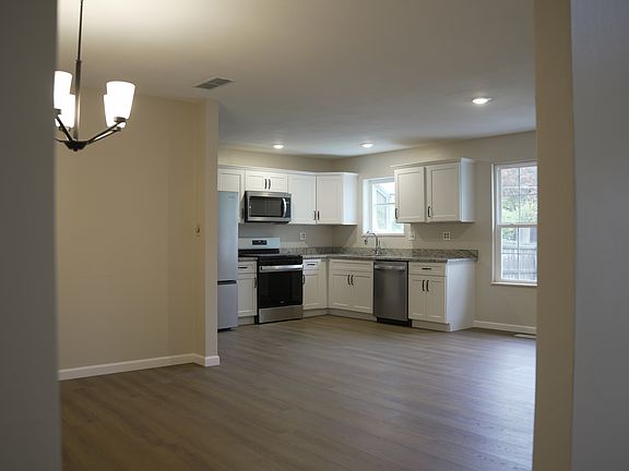 Modern living spaceModern kitchenGranite countertopsStainless steel appliancesNew white soft-close cabinets
