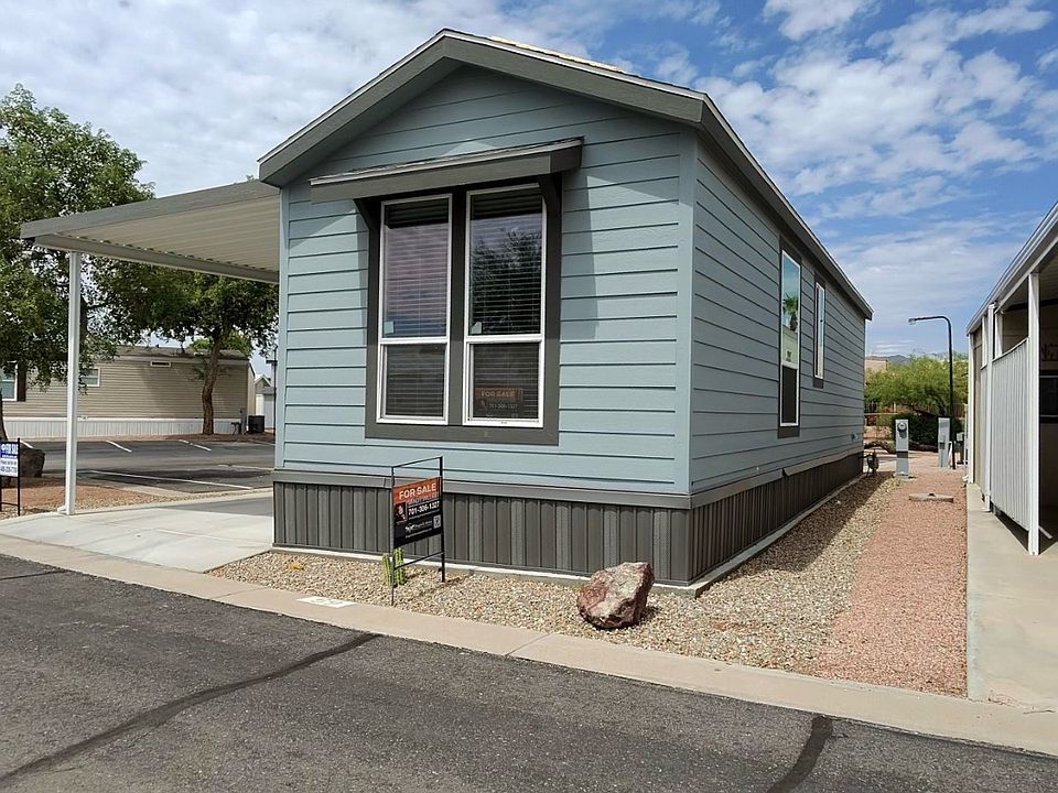 Discover your perfect retirement retreat in this brand-new Cavco Durango home, nestled in Shiprock RV Resort, a premier 55+ community in Apache Junction, AZ. This thoughtfully upgraded 2-bedroom, 1-bath home features soaring 9' ceilings, expanded cabinets in the kitchen and bathroom, and premium finishes throughout: • Stainless steel appliance package & farmhouse sink • 42" tall kitchen cabinets, full-wall tile backsplash, & crescent-edge countertops • Solar tube in the bathroom for natural light • Pre-wired for ceiling fans, upgraded lighting, and programmable thermostat • 8' sliding glass doors, LP Lap siding, & full-length covered concrete driveway • 8'x6' storage shed for added convenience Located in the heart of the Valley of the Sun, Shiprock RV Resort offers a vibrant, active lifestyle. Amenities include a spacious 7,000 sq. ft. recreation hall with a stage, auditorium, and island kitchen, plus a billiards room, library, and coin-free laundry. Outdoors, enjoy a resort-style lap pool, therapeutic spa, putting green, off-leash dog park, and BBQ patio. Make Shiprock your home for new friends, new memories, and endless possibilities! Stay connected with free clubhouse Wi-Fi and wired internet at every site. With a monthly schedule of dinners, dances, fitness classes, guided hikes, and more, you can live as relaxed or as active as you like. Whether you're a snowbird or a full-time resident, you'll enjoy breathtaking Superstition Mountain views and a welcoming community. Annual lot rent is $6000 per year. #ApacheJunction #Gated55Community #MoveInReady #MountainViews #ArizonaRetirementLiving #MesaSnowbirds #ActiveAdults #DesertLiving #UpdatedMobileHome #MotorcycleFriendly #AffordableHousing #SnowbirdHome #ActiveLifestyle #NewRenovations #MountainSunsets #RetireInArizona #SeniorCommunity #GreenSpaces #JamSessions #ArizonaRealEstate mobile home for sale in Apache Junction, AZ, gated 55+ community, affordable senior housing in Arizona, updated mobile home in AZ, mountain views and sunsets, active retirement community, Mesa mobile home with workshop, motorcycle-friendly 55+ community, MesaSnowbirds