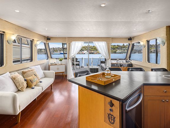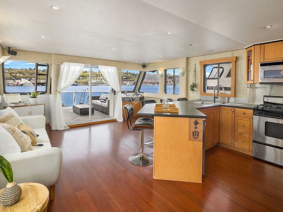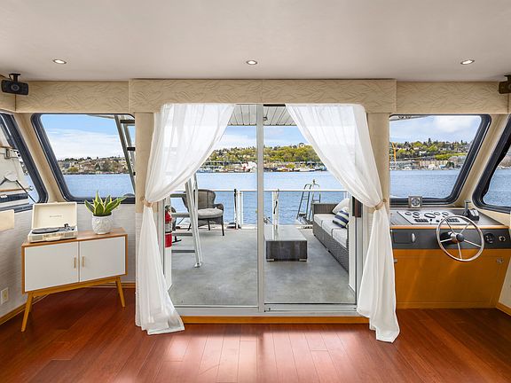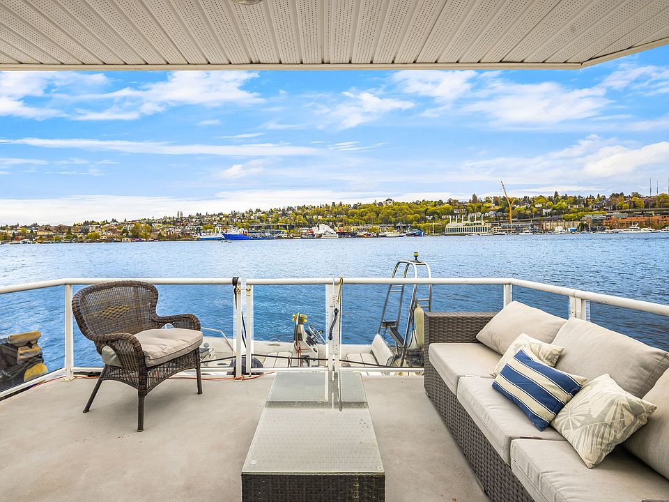 Orca // Be mesmerized by the spectacular end-of-dock location with a million-dollar view of Lake Union, Downtown, and the Space Needle. This one has it all with 4 bedrooms, a spacious roof-top deck, a hot tub, a small boat (included in the sale), 50-amp electrical service, aluminum pontoons, and generous living spaces. Watch the sunrise, seaplanes activity, 4th of July fireworks, Christmas Ships Parade, the antics of the Duck Dodge sailing race, or hop on a kayak, paddleboard, or the small boat. Gated, well-maintained & peaceful marina with few liveaboards includes access to a common room with coin-op laundry, kitchenette, couches, ice maker, restroom, wifi & TV, and storage units. Seattle-approved houseboat #822. No AirBnB.