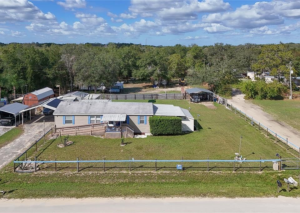 Country Charmer in Umatilla – 4 Beds, 2 Baths on Nearly Half an Acre If you're lookin’ for a place with room to roam and all the comforts of home, this sweet Umatilla property might just be the one. Set on a fully fenced 0.4-acre lot, this well-kept 4-bedroom, 2-bath home has a handy split floor plan, a two-car carport, three gate entrances, and several outbuildings perfect for workshops, storage, or hobbies. Out front, there's a ramp up to the covered porch – a perfect spot to sit a spell and enjoy the peaceful neighborhood view. Inside, the family room welcomes you with soft carpet underfoot, a big front window, and a cozy electric fireplace for those chilly Florida evenings. The space flows right into a large dining area and a big ol’ kitchen with plenty of room to cook, gather, and work. The kitchen's got a built-in desk, glass-front cabinets, upgraded appliances, and tons of counter space. The catty-corner sink with a window overlooking the backyard is a favorite feature, plus there’s a breakfast bar for quick meals or extra seating. Down one hallway, you'll find two comfy bedrooms with ceiling fans and closets, along with a full guest bath that has a tub and shower. On the other side of the home sits the third bedroom with double doors, carpet, and views of the front yard—great for guests, an office, or a hobby room. The primary suite is roomy and private, with a walk-in closet and windows that bring in lots of light. The attached bathroom has a double vanity, plenty of storage, linoleum floors, and a walk-in shower with glass doors. This home gives you that quiet country feel but still keeps you close to town, parks, and entertainment. With lots of space to entertain, work on projects, or just enjoy the simple life, it’s a must-see.