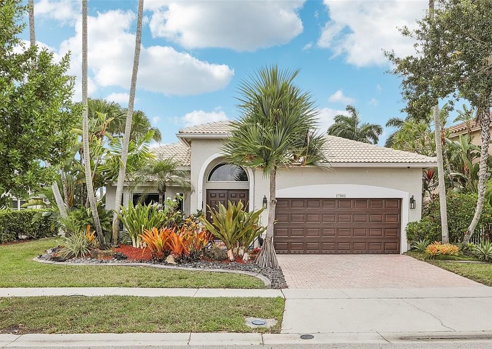 You won't find a more lovingly cared for home than this stunning 3-bedroom, 2-bath waterfront retreat with 2,338 sq. ft. of living space. Every detail in this IBIS model has been thoughtfully designed to maximize beauty, comfort, and peace of mind. As soon as you step in, you are drawn outside to your own private resort-style oasis featuring a HEATED refreshing pool and relaxing spa, take in the gorgeous marble floors which flow to the natural travertine decking, eco fuel fire pit, and a fully equipped custom OUTDOOR STONE KITCHEN with a built-in gas grill, sink, and Big Green Egg. Unwind beneath the custom imported sail shade. A one-of-a-kind feature that provides the perfect amount of shade by the pool for the perfect “al fresco” dining experience. A lush exotic landscape, frames the exterior. Every evening the OUTDOOR LIGHTING and bluetooth enabled sound system creates a magical atmosphere. Inside, the home is equally impressive. Enjoy large light marble flooring throughout the main living areas, engineered dark wood throughout the master bedroom, sitting area and closets, fully remodeled bathrooms with elegant marble countertops, solid wood custom vanity cabinets and a luxurious primary bath with a custom air bath-spa and rain shower. Enjoy the benefits of a very reasonable HOA that includes 24-hour gated security with a guardhouse and roving patrols cars. The home comes equipped with an ADT-monitored security system. Both FRONT AND BACK LAWN CARE-as well as lake maintenance are FULLY COVERED. Lawn irrigation uses reclaimed lake water, maintained by the association. Annual mulching and community-wide hurricane preparation, including tree trimming in all yards, are also included. Other premium upgrades include: PGT- (Progressive Glass Technology) rated Cat. 5 HURRICANE-IMPACT glass windows and sliding doors. TILE ROOF is in excellent condition. OUTDOOR BLUETOOTH sound system. Custom wood-planked patio ceiling. TANKLESS WATER HEATER system. External gas tank. Solar panels system (covering full energy use-age) . 240V outlet for Level 2 EV charger installed in the garage HURRICANE RATED ELECTRIC GARAGE DOOR. This home truly has it all style, safety, energy efficiency and sustainability. If you've been searching for a home that feels like a luxury getaway every day, this is the one. Schedule your private showing today— you won't want to miss this rare gem!