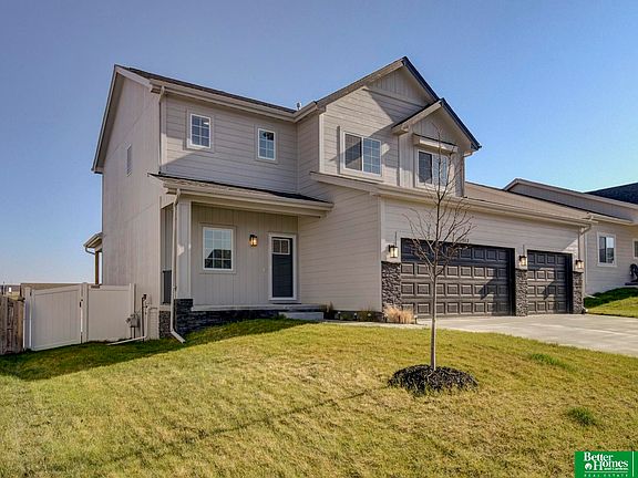 One-year-old two-story in Bennington’s Lakeview 168, just two blocks from a trail leading to 220-acre Flanagan Lake—perfect for summer boating, fishing, paddle-boarding, and cycling. Striking curb appeal with dark garage doors and trim accents. Inside, enjoy clean lines, neutral white paint, and durable LVP flooring. The open kitchen features white cabinetry, quartz countertops, subway tile backsplash, and stainless appliances. A linear electric fireplace with stacked stone surround anchors the main living space. Main floor office and powder bath create an ideal work-from-home setup. Upstairs offers four spacious bedrooms, including a primary suite with tray ceiling, dual vanities, and walk-in closet. Finished lower level includes a family room, egress window, and large storage space with bath rough-in. Covered deck, fully fenced yard.