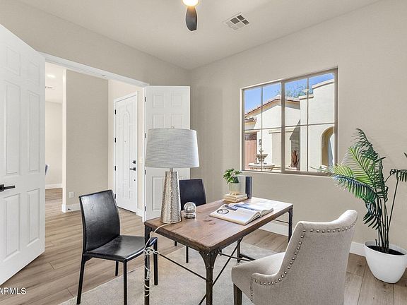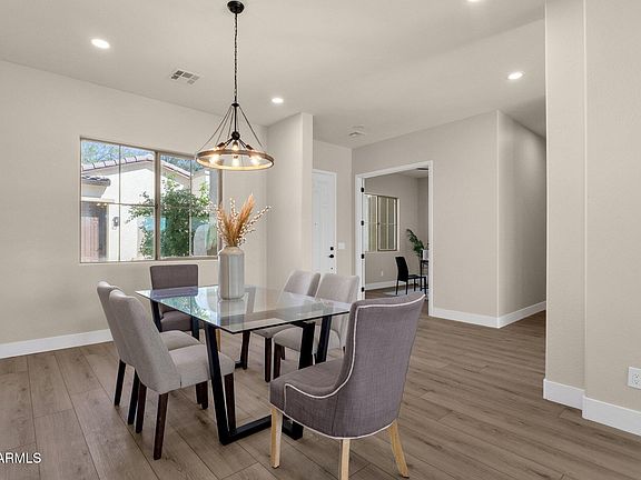 Step through the private, enclosed front courtyard—an ideal spot to enjoy your morning coffee with unobstructed views of the Estrella Mountains. In the evening, unwind or entertain in your serene backyard oasis overlooking the tranquil community lake.
