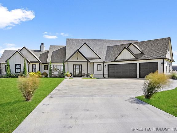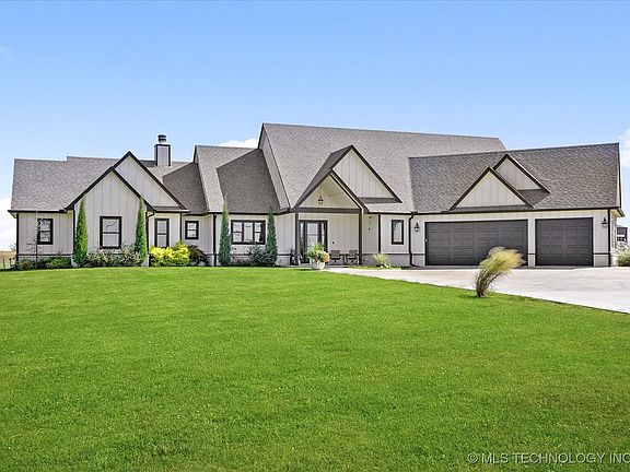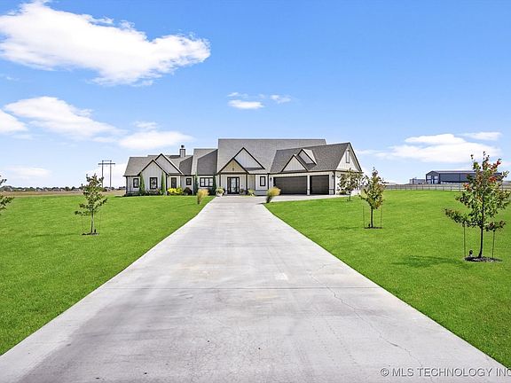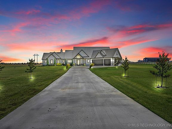 Modern Country Living in Glenpool - 5 Acres & Move-In Ready! Nestled on 5 beautiful acres in Glenpool, this 2020-built home offers the perfect blend of modern comfort and peaceful country living. With nearly 4,000 sq. ft., this 5-bedroom, 4.5-bathroom home features an open-concept layout, high ceilings, and stylish finishes throughout. The spacious kitchen boasts quartz countertops, stainless steel appliances, and a large island, perfect for entertaining. The main level features wood and tile floors throughout, adding warmth and elegance. An office nook off the living room provides the perfect space for a home office. The primary suite is a true retreat with a spa-like en-suite bath and a generous walk-in closet. A second bedroom with en-suite bath is also located downstairs, while upstairs, you'll find three additional bedrooms and a game room or theater room, offering endless possibilities for entertainment or relaxation. A standout feature of this home is the 4-car garage with a pull-through door to the backyard, making lawn maintenance a breeze. Enjoy peaceful evenings on the covered patio, overlooking your private acreage, with plenty of space for a pool, livestock, or outdoor activities. Located just minutes from highways, shopping, and dining, this home offers the perfect balance of privacy and convenience. Don't miss this rare opportunity to own a newer home on acreage in Glenpool! Schedule your private showing today!