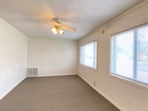 Just 7 minutes from your local grocery store, this property features a ceiling fan and picture window in the living.