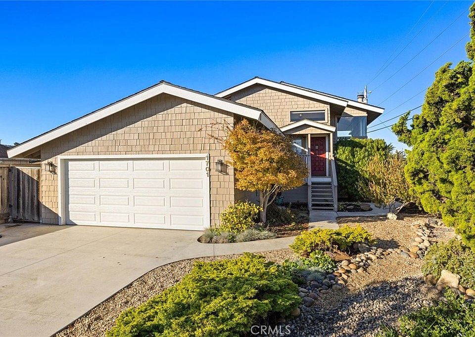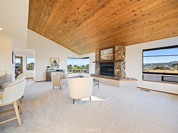 Gorgeous views of Morro Bay Estuary, Morro Rock, Morro Bay Golf Course, Hollister Peak, Black Hill, and more. You won't want to miss this beautifully renovated spacious beach home nicely situated on large corner lot. Updated with new carpeting/flooring, fresh paint, new patios, walkways, decks, landscaping, concrete driveway, and garage floor. Spacious three-bedroom two bath + powder room. Ensuite primary bedroom with french doors opening into patio/garden area, bringing the outdoor beauty inside. The spacious high- vaulted cedar ceiling living room has a granite rock fireplace with both a mantle and hearth. The entire room is light and bright with natural lighting coming through the mitered corner windows where you will enjoy the view of Morro Bay Estuary, Rock, and local landmark peaks. Just off the dining area is a wet bar with built-in glass hutch. The thoughtfully renovated large kitchen adds a touch of modern elegance to this classic residence - oven/broiler/microwave/dishwasher/refrigerator/5 burner range and loads of cabinets. There is an abundance of storage both upstairs in the living areas and downstairs in bedrooms, laundry room, and garage. With both northwestern and southwestern exposures, the home is bathed in natural light throughout the day. Garage is attached to the home and includes a workbench and storage cabinets. The laundry room has 220 electric outlet + gas.
