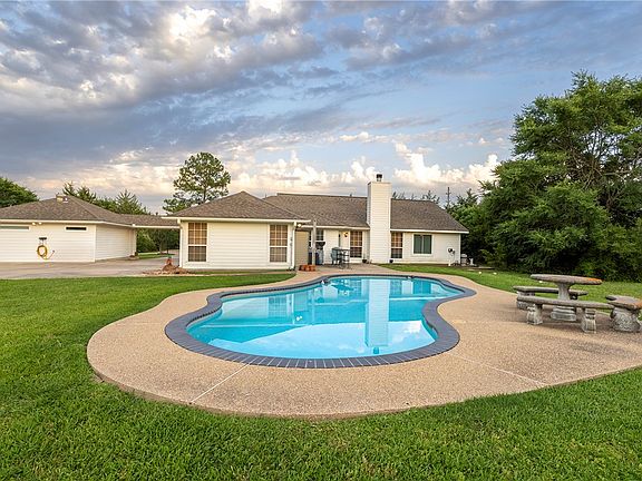 Secluded Two Acre Retreat with Pool, Carter Lake Access, and Income Potential. Tucked away on a peaceful 2-acre lot with access to Carter Lake, this unique property offers the perfect blend of privacy, comfort, and convenience. Whether you're looking for a serene personal residence or an investment opportunity, this home has it all. The main house features a split floorplan with multiple living areas including a sunroom and dedicated office space—great for remote work or quiet relaxation. A wood-burning fireplace adds warmth and charm, while the living room is wired for surround sound, with receiver and speakers negotiable. The kitchen boasts newer appliances and a water filtration system, mirrored in the second kitchen within the separate studio apartment, which can be used for guests or rental income opportunity. The apartment includes a refrigerator and barstools, which convey with the property. Step outside to your private pool and enjoy the expansive outdoor space with two storage sheds and a rear patio cabinet—all included. Located just minutes from shopping, dining, and schools, the home is currently zoned for Southwood Valley Elementary, Oakwood Intermediate, and A&M Consolidated Middle & High Schools. A new roof with 40 year, class 3 impact resistant shingles is also being installed. A rare find combining space, seclusion, and functionality—schedule your showing today!