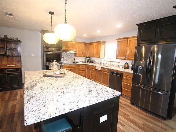 This lovely home boasts many high end updates which you must see! As you walk into this home you are greeted with an open concept floor plan. The remodeled kitchen features high end granite on the beautiful extra large island and countertops as well as new appliances including double ovens and cook top range. The kitchen overlooks the living room with a nice fireplace and dining area which has newly installed laminate wood in all the bedrooms and large with great closets and new carpet. As you walk into the backyard the covered patio is a dream for entertaining or watch the lovely sunsets and sitting in the shade by the big mature tree.This home has newer windows, fresh paint and fantastic mature landscaping.