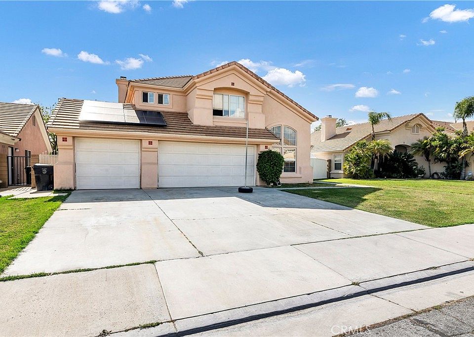 Welcome to this charming 2-story home nestled in a beautiful, serene neighborhood in Hemet. With wide streets and sidewalks, this area offers a peaceful ambiance perfect for families and individuals alike. Step into the upgraded kitchen featuring quartz countertops and custom cabinets, offering a blend of elegance and functionality. The high ceilings on the first floor create an airy and spacious atmosphere, perfect for entertaining or relaxing. The master bedroom welcomes you with double doors, while the attached master bath features a generous soaking tub, separate shower, and Jack and Jill dual sinks, adding a touch of luxury to your daily routine. Enjoy ample storage space with walk-in closets and high ceilings in the master bedroom. Natural light enthusiasts will appreciate the skylight, adding brightness and warmth to the home. With a 3-car garage and a huge Alum wood patio cover, this home offers both convenience and outdoor enjoyment. The backyard is enclosed with block wall fencing, providing security and privacy for outdoor gatherings or relaxation. This home boasts solar panels, providing both sustainability and cost-saving benefits for your electric needs. For families with children, schools are within walking distance, while shopping centers are just a 5-minute drive away. Don't miss out on the opportunity to make this lovely home yours in this desirable neighborhood.