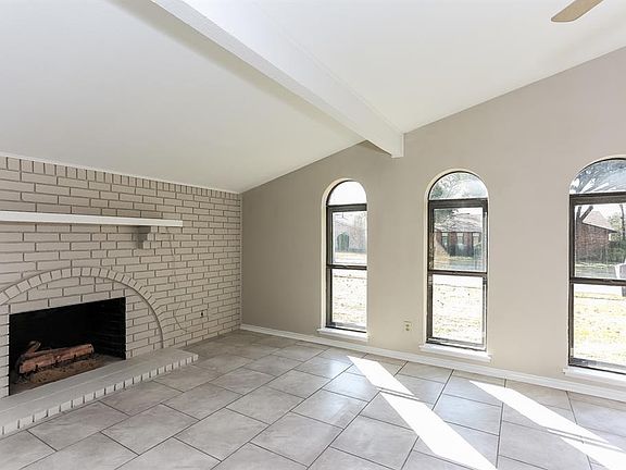 This Plano one-story home offers an in-ground pool, covered patio, gas fireplace, vaulted living room ceiling, kitchen breakfast bar, and a two-car garage.