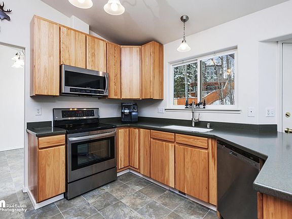 Immaculate 5 bedroom 2.5 bath home with a family room on lower hillside in south Anchorage. Vaulted ceilings, hardwood hickory floors, kitchen with corian countertops, 42 inch hickory cabinets, stainless steele appliances. Master bedroom and Family room on the same floor, Trails that go to Service High school. Beautiful spruce trees in the backyard, large deck to have gatherings