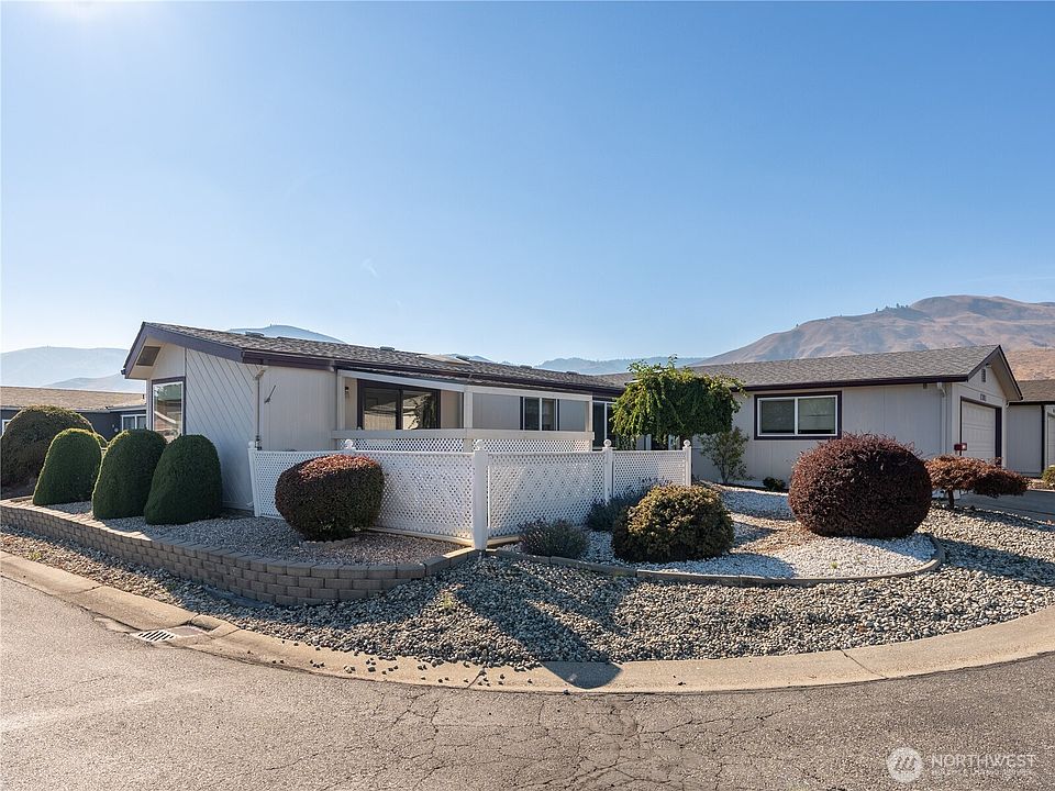 The newly-built covered patio is a welcoming retreat from the elements and enhances the privacy of this beautifully maintained 3-bedroom home. Vaulted ceilings amplify the open, inviting atmosphere, while the light-filled kitchen showcases quartz countertops, new cabinetry, and an island with an eating bar. Notable upgrades include a completely replaced plumbing system, updated HVAC, new roof, modern hallway tub/shower combination, and new windows. Wood flooring flows throughout the main living areas. Enjoy mountain views from the large picture windows and the convenience of being across from the pool, along with a two-car garage. The home is situated on leased land, with water, sewer & garbage services included in the monthly lease fee.