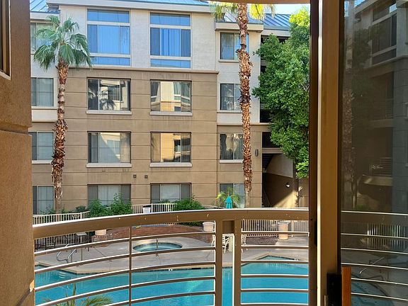 Welcome to the Biltmore Corridor where everything is conveniently located, from many different eateries nearby, the 51 freeway access and shopping galore! This home has a fresh coat of paint and attractive vinyl flooring throughout. Your great room boasts resort style living with amazing views of one of three community pools and jacuzzi! Enjoy coffee or cocktails from the private balcony in this 2 bed 2 bath home. The kitchen is light and bright with white cabinets & appliances. The great room is open and spacious with views of palm trees and sunshine. The community amenities also include a fitness center with sauna in the locker rooms, clubhouse, conference room and business center. Waiting for you to personalize, this home is move in ready!